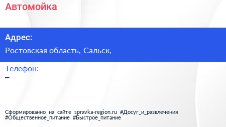 Автомойка по адресу Ростовская область, Сальск, в дальнейшем Организация, размещена в следующих категориях: