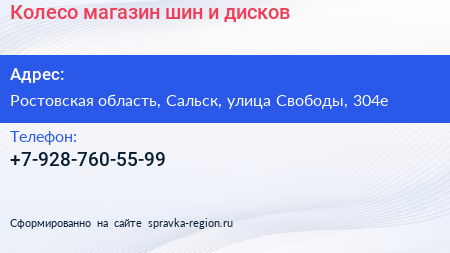 Колесо, магазин шин и дисков по адресу Ростовская область, Сальск, улица Свободы, 304е в дальнейшем Организация, размещена в следующих категориях:
