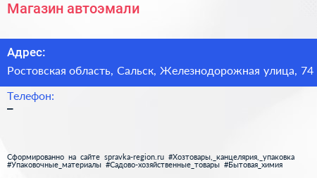 Магазин автоэмали по адресу Ростовская область, Сальск, Железнодорожная улица, 74 в дальнейшем Организация, размещена в следующих категориях:
