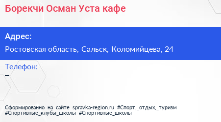 Борекчи Осман Уста, кафе по адресу Ростовская область, Сальск, Коломийцева, 24 в дальнейшем Организация, размещена в следующих категориях:
