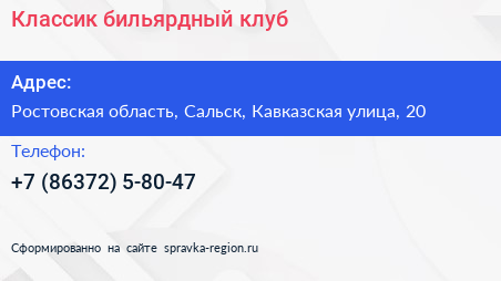 Классик, бильярдный клуб по адресу Ростовская область, Сальск, Кавказская улица, 20 в дальнейшем Организация, размещена в следующих категориях: