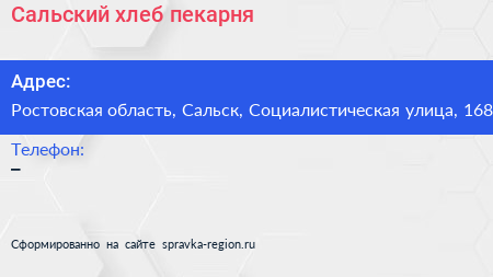 Сальский хлеб, пекарня по адресу Ростовская область, Сальск, Социалистическая улица, 168 в дальнейшем Организация, размещена в следующих категориях: