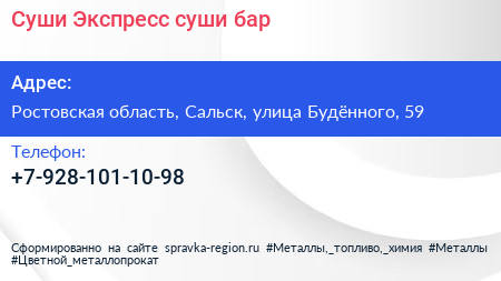 Суши Экспресс, суши-бар по адресу Ростовская область, Сальск, улица Будённого, 59 в дальнейшем Организация, размещена в следующих категориях: