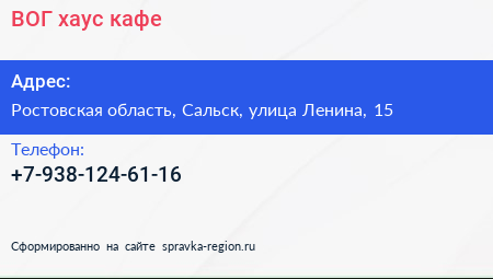 ВОГ хаус, кафе по адресу Ростовская область, Сальск, улица Ленина, 15 в дальнейшем Организация, размещена в следующих категориях: