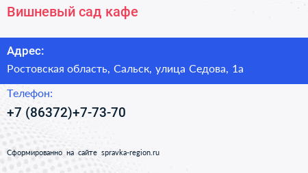 Вишневый сад, кафе по адресу Ростовская область, Сальск, улица Седова, 1а в дальнейшем Организация, размещена в следующих категориях:
