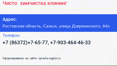 Чисто+, химчистка-клининг по адресу Ростовская область, Сальск, улица Дзержинского, 64л в дальнейшем Организация, размещена в следующих категориях: