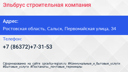 Эльбрус, строительная компания по адресу Ростовская область, Сальск, Первомайская улица, 34 в дальнейшем Организация, размещена в следующих категориях: