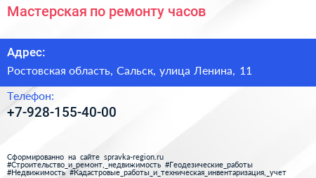 Мастерская по ремонту часов по адресу Ростовская область, Сальск, улица Ленина, 11 в дальнейшем Организация, размещена в следующих категориях: