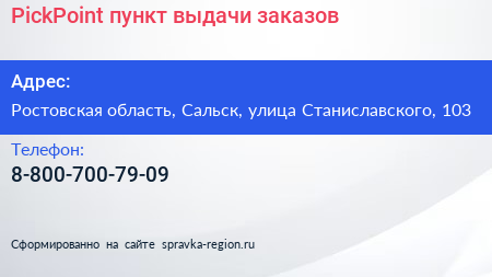 PickPoint, пункт выдачи заказов по адресу Ростовская область, Сальск, улица Станиславского, 103 в дальнейшем Организация, размещена в следующих категориях: