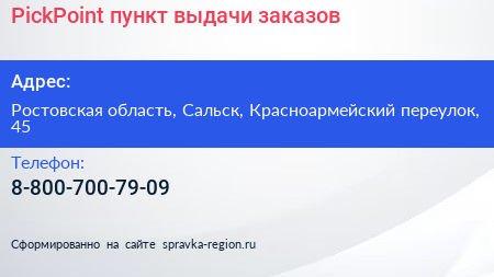 PickPoint, пункт выдачи заказов по адресу Ростовская область, Сальск, Красноармейский переулок, 45 в дальнейшем Организация, размещена в следующих категориях: