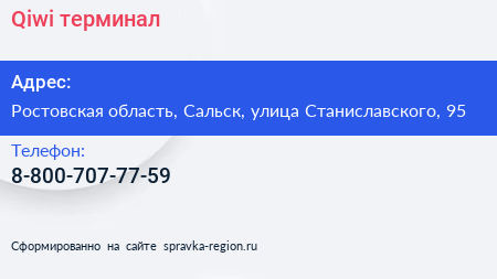 Qiwi, терминал по адресу Ростовская область, Сальск, улица Станиславского, 95 в дальнейшем Организация, размещена в следующих категориях:
