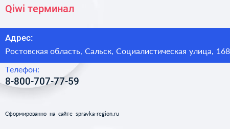 Qiwi, терминал по адресу Ростовская область, Сальск, Социалистическая улица, 168 в дальнейшем Организация, размещена в следующих категориях: