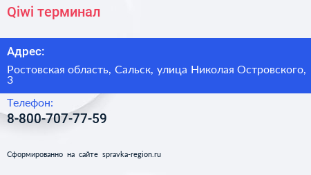 Qiwi, терминал по адресу Ростовская область, Сальск, улица Николая Островского, 3 в дальнейшем Организация, размещена в следующих категориях: