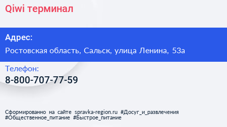 Qiwi, терминал по адресу Ростовская область, Сальск, улица Ленина, 53а в дальнейшем Организация, размещена в следующих категориях: