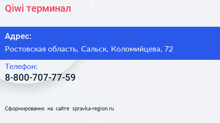 Qiwi, терминал по адресу Ростовская область, Сальск, Коломийцева, 72 в дальнейшем Организация, размещена в следующих категориях: