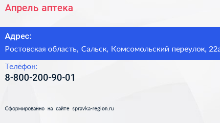 Апрель, аптека по адресу Ростовская область, Сальск, Комсомольский переулок, 22а в дальнейшем Организация, размещена в следующих категориях: