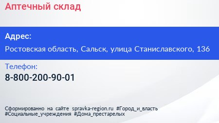 Аптечный склад по адресу Ростовская область, Сальск, улица Станиславского, 136 в дальнейшем Организация, размещена в следующих категориях: