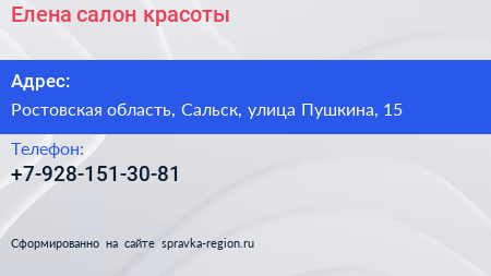 Елена, салон красоты по адресу Ростовская область, Сальск, улица Пушкина, 15 в дальнейшем Организация, размещена в следующих категориях: