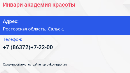Инвари, академия красоты по адресу Ростовская область, Сальск, в дальнейшем Организация, размещена в следующих категориях: