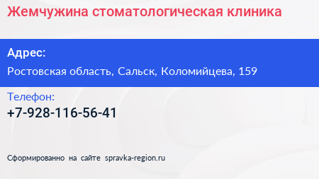 Жемчужина, стоматологическая клиника по адресу Ростовская область, Сальск, Коломийцева, 159 в дальнейшем Организация, размещена в следующих категориях: