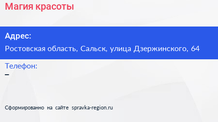 Магия красоты по адресу Ростовская область, Сальск, улица Дзержинского, 64 в дальнейшем Организация, размещена в следующих категориях: