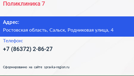 Поликлиника №7 по адресу Ростовская область, Сальск, Родниковая улица, 4 в дальнейшем Организация, размещена в следующих категориях: