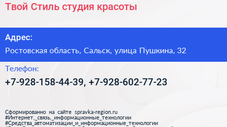 Твой Стиль, студия красоты по адресу Ростовская область, Сальск, улица Пушкина, 32 в дальнейшем Организация, размещена в следующих категориях: