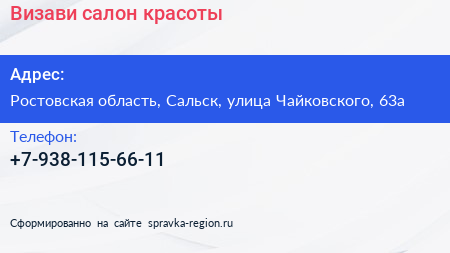Визави, салон красоты по адресу Ростовская область, Сальск, улица Чайковского, 63а в дальнейшем Организация, размещена в следующих категориях:
