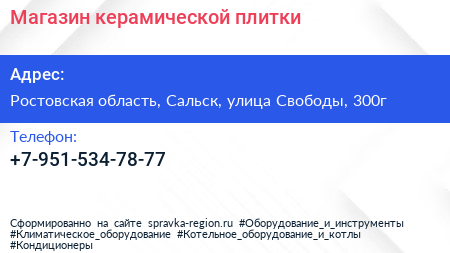 Магазин керамической плитки по адресу Ростовская область, Сальск, улица Свободы, 300г в дальнейшем Организация, размещена в следующих категориях: