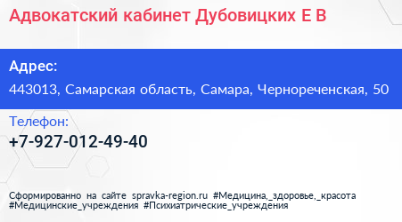 Адвокатский кабинет Дубовицких Е.В. по адресу 443013, Самарская область, Самара, Чернореченская, 50 в дальнейшем Организация, размещена в следующих категориях: