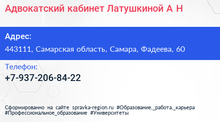 Адвокатский кабинет Латушкиной А.Н. по адресу 443111, Самарская область, Самара, Фадеева, 60 в дальнейшем Организация, размещена в следующих категориях: