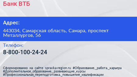 Банк ВТБ по адресу 443034, Самарская область, Самара, проспект Металлургов, 56 в дальнейшем Организация, размещена в следующих категориях: