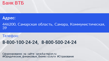 Банк ВТБ по адресу 446200, Самарская область, Самара, Коммунистическая, 39 в дальнейшем Организация, размещена в следующих категориях: