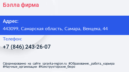 Бэлла, фирма по адресу 443099, Самарская область, Самара, Венцека, 44 в дальнейшем Организация, размещена в следующих категориях: