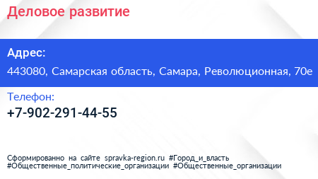 Деловое развитие по адресу 443080, Самарская область, Самара, Революционная, 70е в дальнейшем Организация, размещена в следующих категориях: