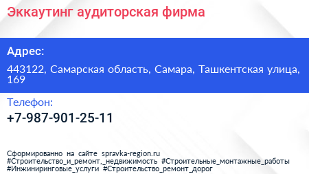 Эккаутинг, аудиторская фирма по адресу 443122, Самарская область, Самара, Ташкентская улица, 169 в дальнейшем Организация, размещена в следующих категориях: