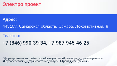 Электро проект по адресу 443109, Самарская область, Самара, Локомотивная, 8 в дальнейшем Организация, размещена в следующих категориях: