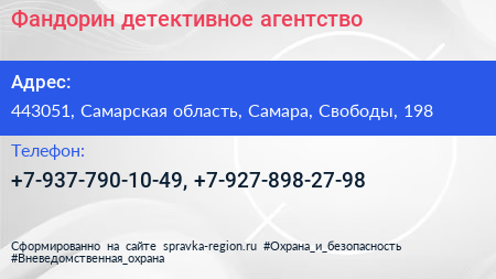 Фандорин, детективное агентство по адресу 443051, Самарская область, Самара, Свободы, 198 в дальнейшем Организация, размещена в следующих категориях: