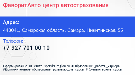 ФаворитАвто, центр автострахования по адресу 443041, Самарская область, Самара, Никитинская, 55 в дальнейшем Организация, размещена в следующих категориях: