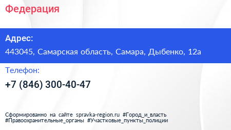 Федерация по адресу 443045, Самарская область, Самара, Дыбенко, 12а в дальнейшем Организация, размещена в следующих категориях: