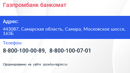 Газпромбанк, банкомат по адресу 443087, Самарская область, Самара, Московское шоссе, 163Б в дальнейшем Организация, размещена в следующих категориях: