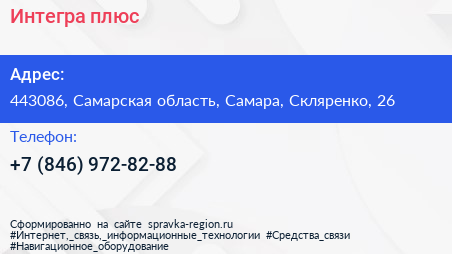 Интегра плюс по адресу 443086, Самарская область, Самара, Скляренко, 26 в дальнейшем Организация, размещена в следующих категориях: