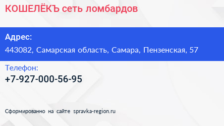 КОШЕЛЁКЪ, сеть ломбардов по адресу 443082, Самарская область, Самара, Пензенская, 57 в дальнейшем Организация, размещена в следующих категориях: