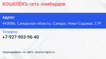 КОШЕЛЁКЪ, сеть ломбардов по адресу 443086, Самарская область, Самара, Ново-Садовая, 179 в дальнейшем Организация, размещена в следующих категориях: