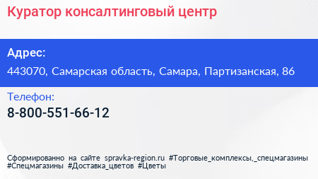 Куратор, консалтинговый центр по адресу 443070, Самарская область, Самара, Партизанская, 86 в дальнейшем Организация, размещена в следующих категориях: