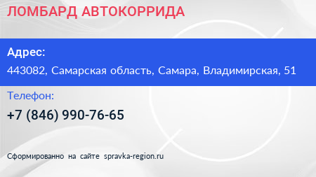 ЛОМБАРД АВТОКОРРИДА по адресу 443082, Самарская область, Самара, Владимирская, 51 в дальнейшем Организация, размещена в следующих категориях: