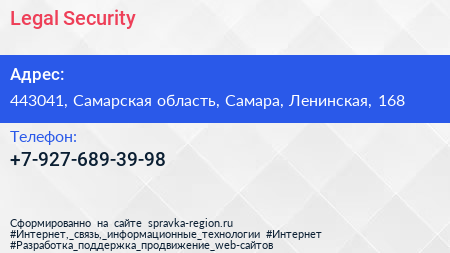 Legal Security по адресу 443041, Самарская область, Самара, Ленинская, 168 в дальнейшем Организация, размещена в следующих категориях: