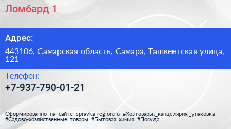 Ломбард №1 по адресу 443106, Самарская область, Самара, Ташкентская улица, 121 в дальнейшем Организация, размещена в следующих категориях: