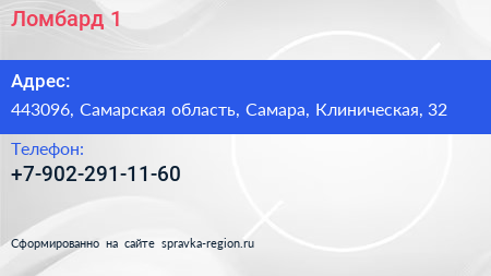 Ломбард №1 по адресу 443096, Самарская область, Самара, Клиническая, 32 в дальнейшем Организация, размещена в следующих категориях: