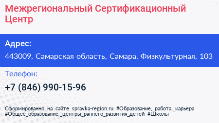 Межрегиональный Сертификационный Центр по адресу 443009, Самарская область, Самара, Физкультурная, 103 в дальнейшем Организация, размещена в следующих категориях:
